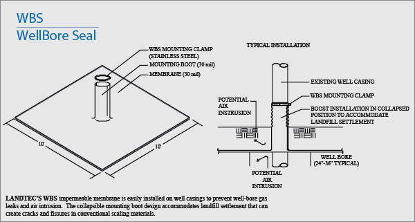 Versatile, Easy-to-Install Design Accommodates Settlement The WBS design utilizes a strong, 30 mil. PVC membrane with a stovepipe shaped boot in the center. The WBS membrane covers a 10 x 10 foot area and is installed just below the landfill surface. The boot is fastened to the well casing just above the landfill surface with a stainless steel clamp and is installed in a collapsed position to accommodate future settlement around the well casing. As settlement occurs, resulting from the normal decomposition and compaction of he loose void spaces within the refuse, the collapsed boot will elongate. Before the boot reaches its full elastic limit from the settlement, the landfill technician can easily readjust the boot to a new collapsed position. To do so, the technician simply loosens the boot clamp, collapses the boot to a lower position and then re-tightens the clamp to regain the airtight seal. The WBS boot design provides a quick and easy technique for accommodating landfill settlement that can range from a few inches a year to many feet per year depending on many factor, including landfill depth, compaction and moisture content. This ongoing settlement can create cracks fissures at the landfill surface particularly at well bores and well casings. Compatible with All Well-Bore Sealing Methods The versatile WBS membrane is compatible with well-bore installations using typical seal materials including clay, native soils and Bentonite. The WBS can be quickly installed on new well or easily retrofitted on existing wells. LANDTEC products work together to solve specific landfill needs. All LANDTEC products are designed for the specific needs of the landfill industry. The WBS was designed to work with LANDTEC’s gas extraction products including ACCU-FLO wellheads, which provide faster and easier data collection to optimize gas extraction. These products are based on over a decade of operation experience applying landfill gas management principles at multiple sites by LANDTEC. LANDTEC’s products are backed by a warranty that our customer can depend upon. Wellbore Seal Boot Only 3-4" Wellcasing Wellbore Seal Boot Only 6" Wellcasing Wellbore Seal 10' Skirt 8" Wellcasing Wellbore Seal 10' Skirt 6" Wellcasing Wellbore Seal 10' Skirt 3-4" Wellcasing